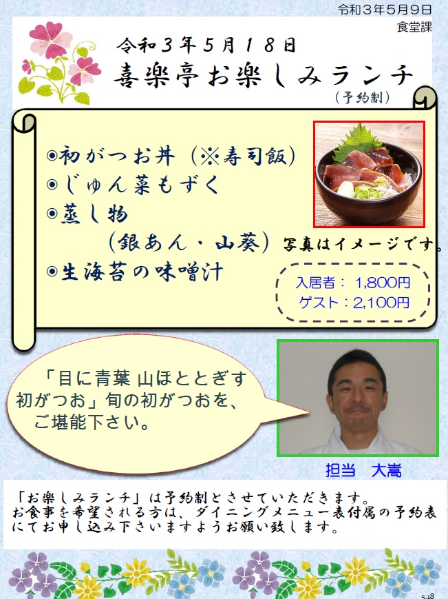 再開後初のメニューとして、「初カツオ丼」を提供いたしました。