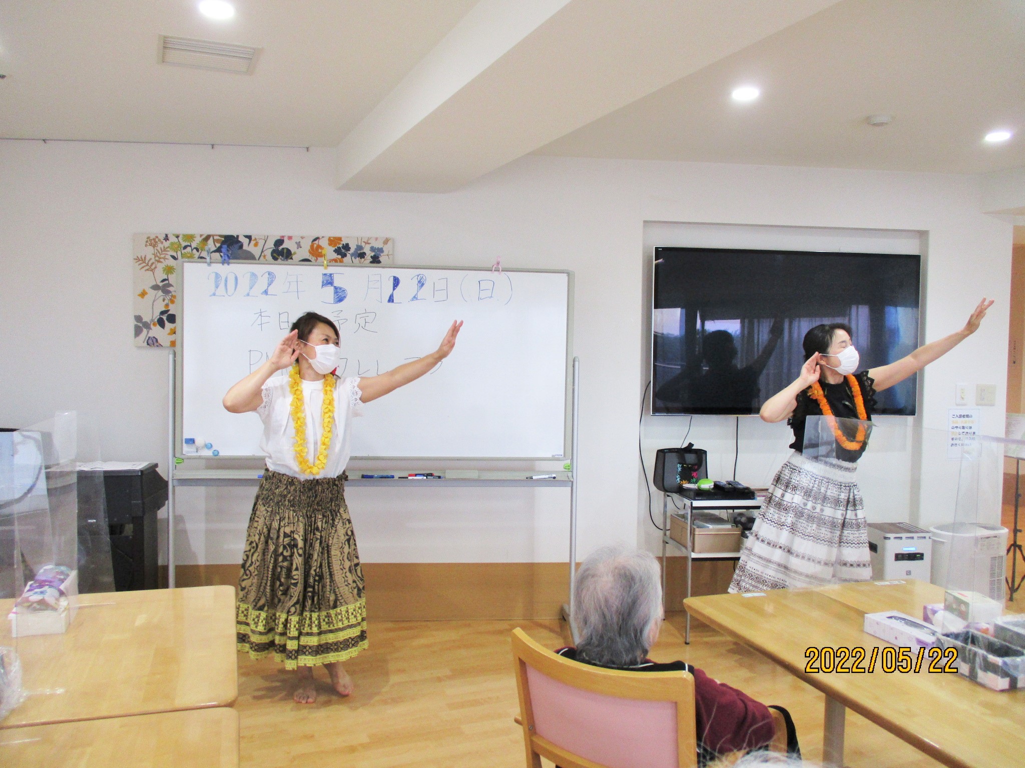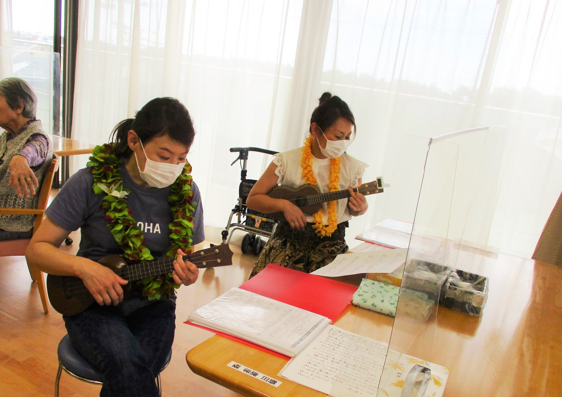 毎月1回、ウクレレの生演奏に合わせて懐かしい歌を歌ったり、フラを踊ったりして身体を動かしています。