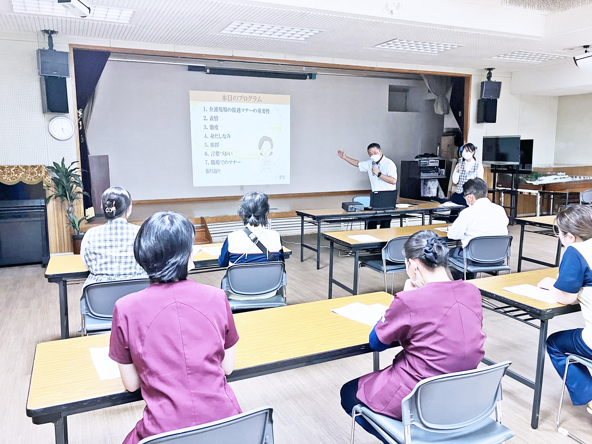 職員が講師を務め、マナーや身だしなみ、言葉遣いについて改めて確認を行いました。