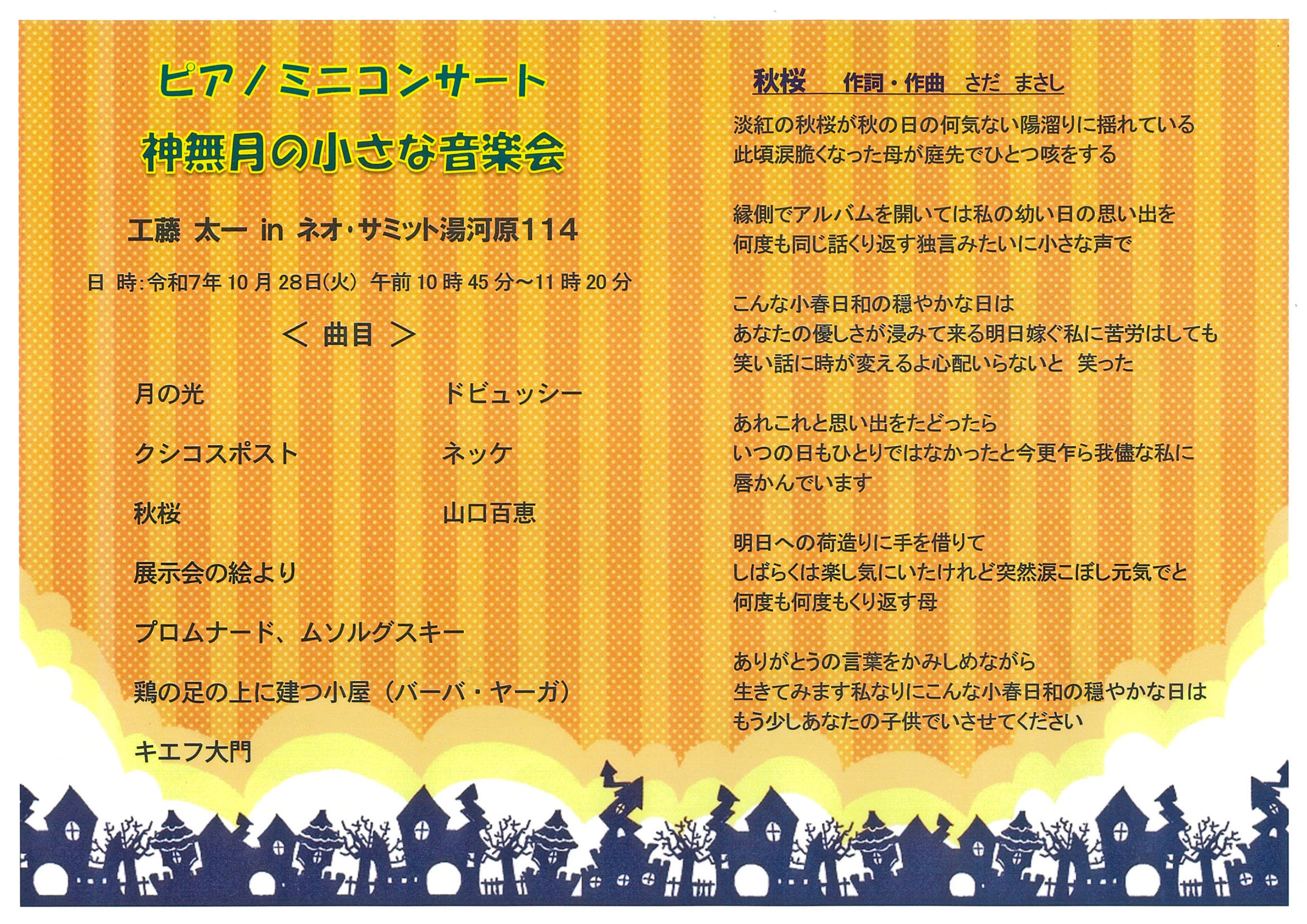 今月のピアノコンサートは「神無月の小さな音楽会」と題して、ドビュッシーの