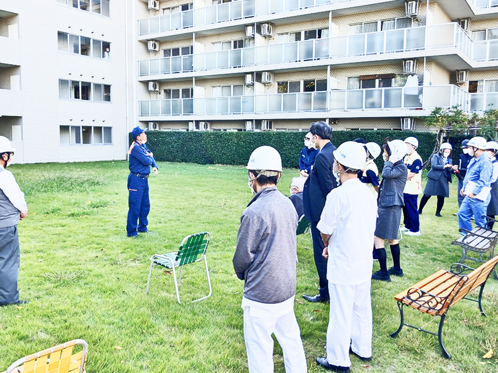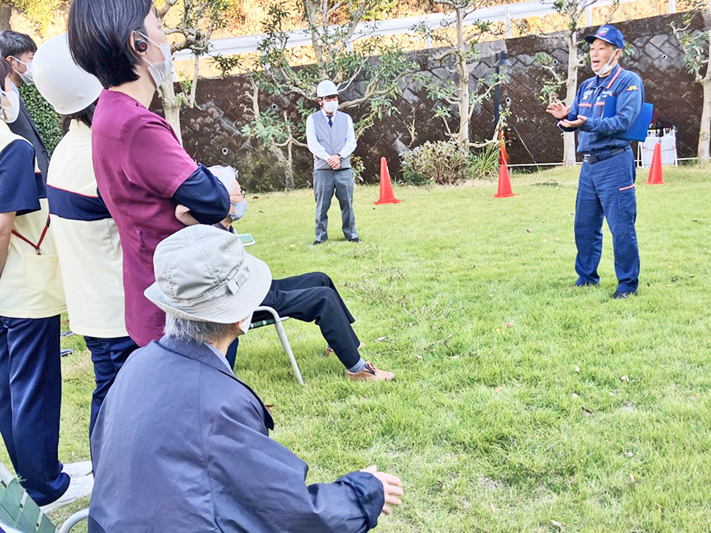 今回は介護棟での出火を想定し、ご入居者の皆様を安全に誘導する訓練などを実施しました。