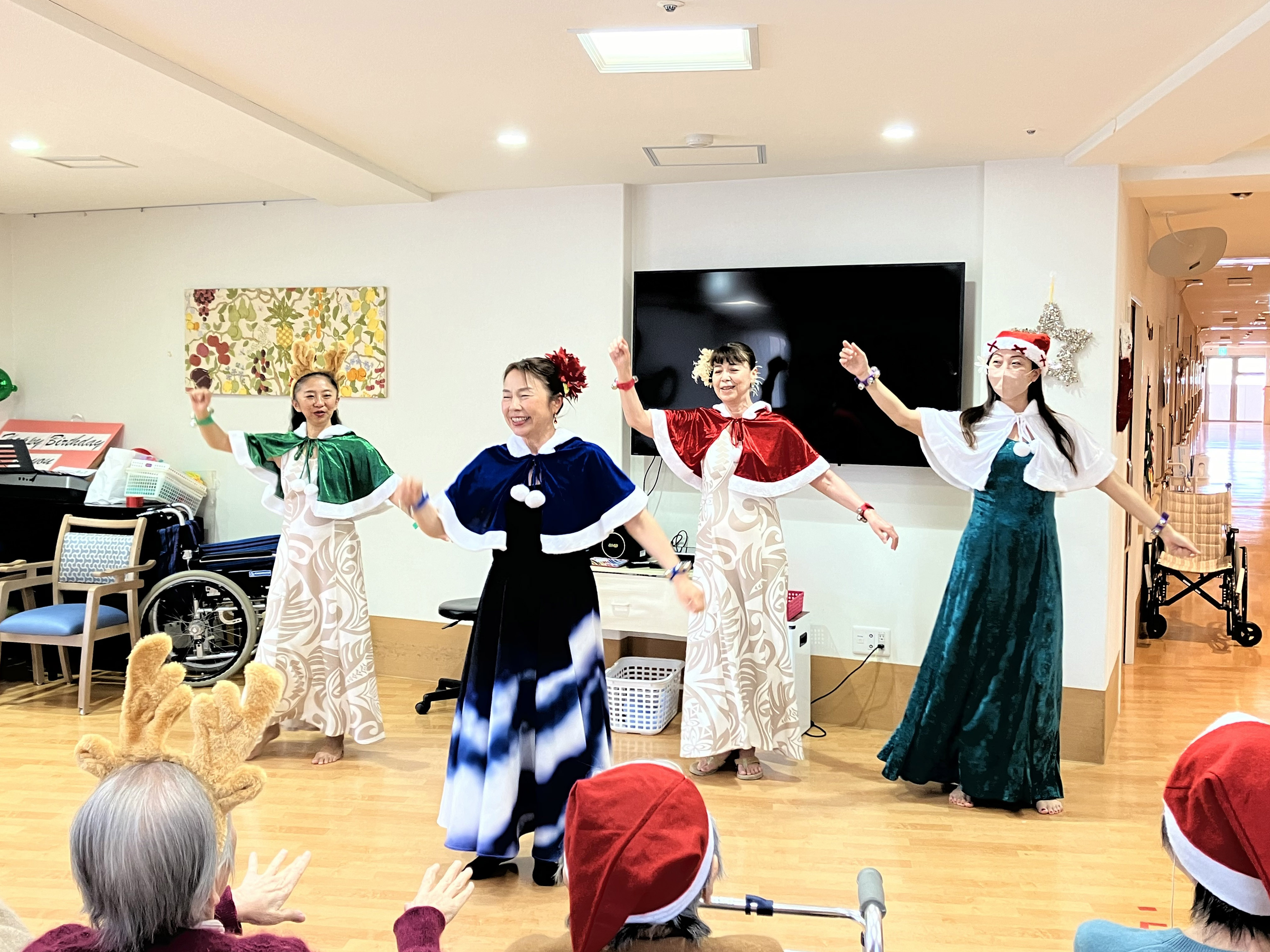 4名のスタッフそれぞれ、ご入居者の皆様とご一緒に歌ったり踊ったりいたしました。