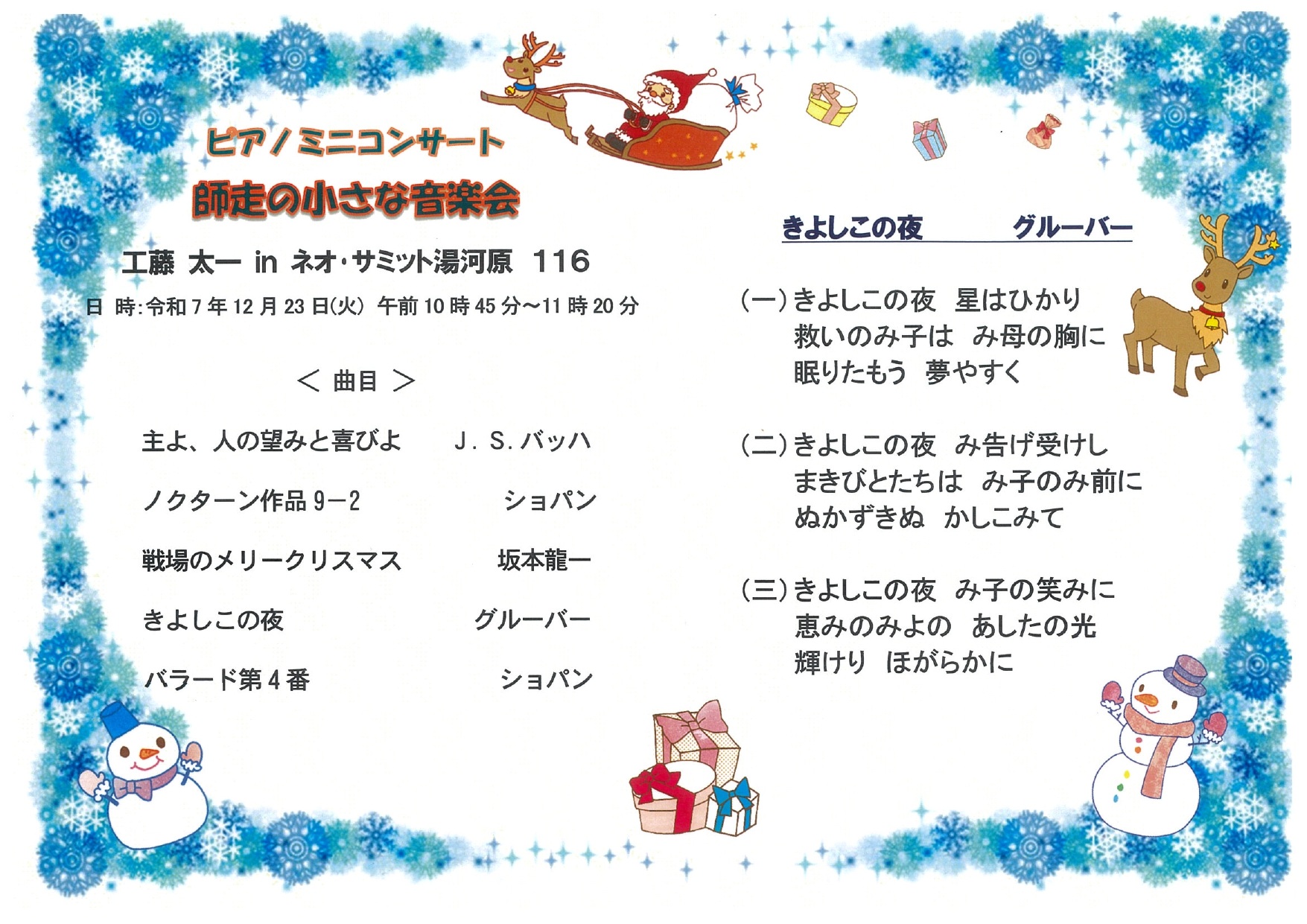 この日は「師走の小さな音楽会」と題して、工藤太一様のピアノミニコンサートを開催しました。