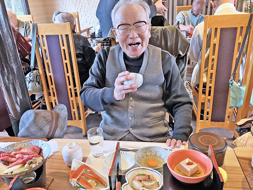 昼食は庭園を眺めながら、すき焼きや天ぷらなどの懐石料理をいただきました。