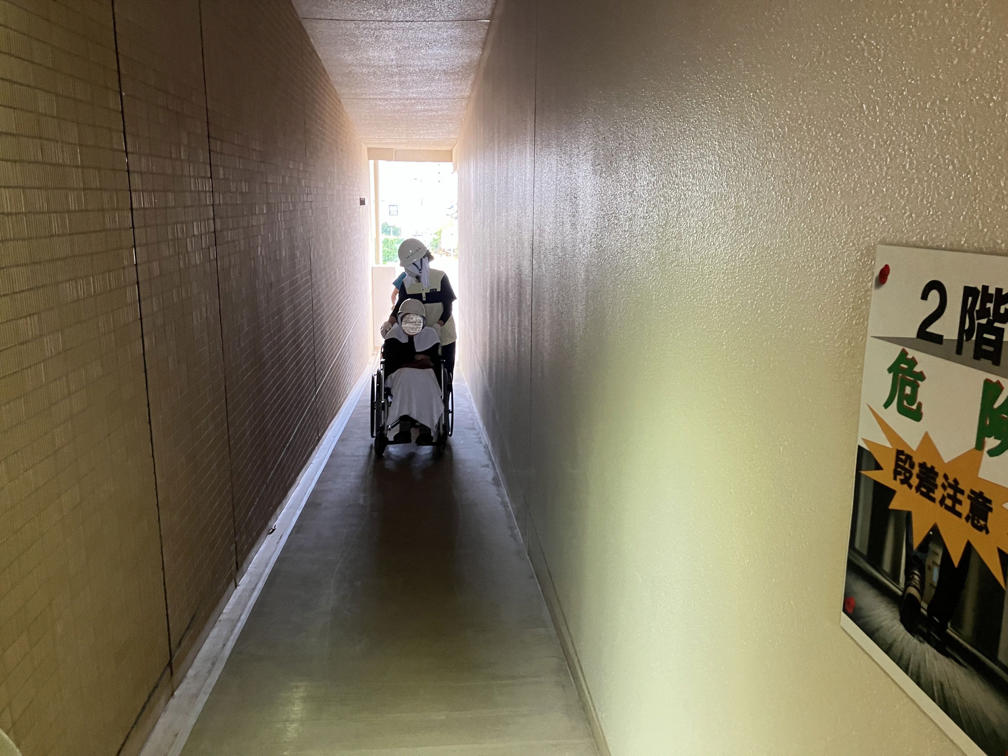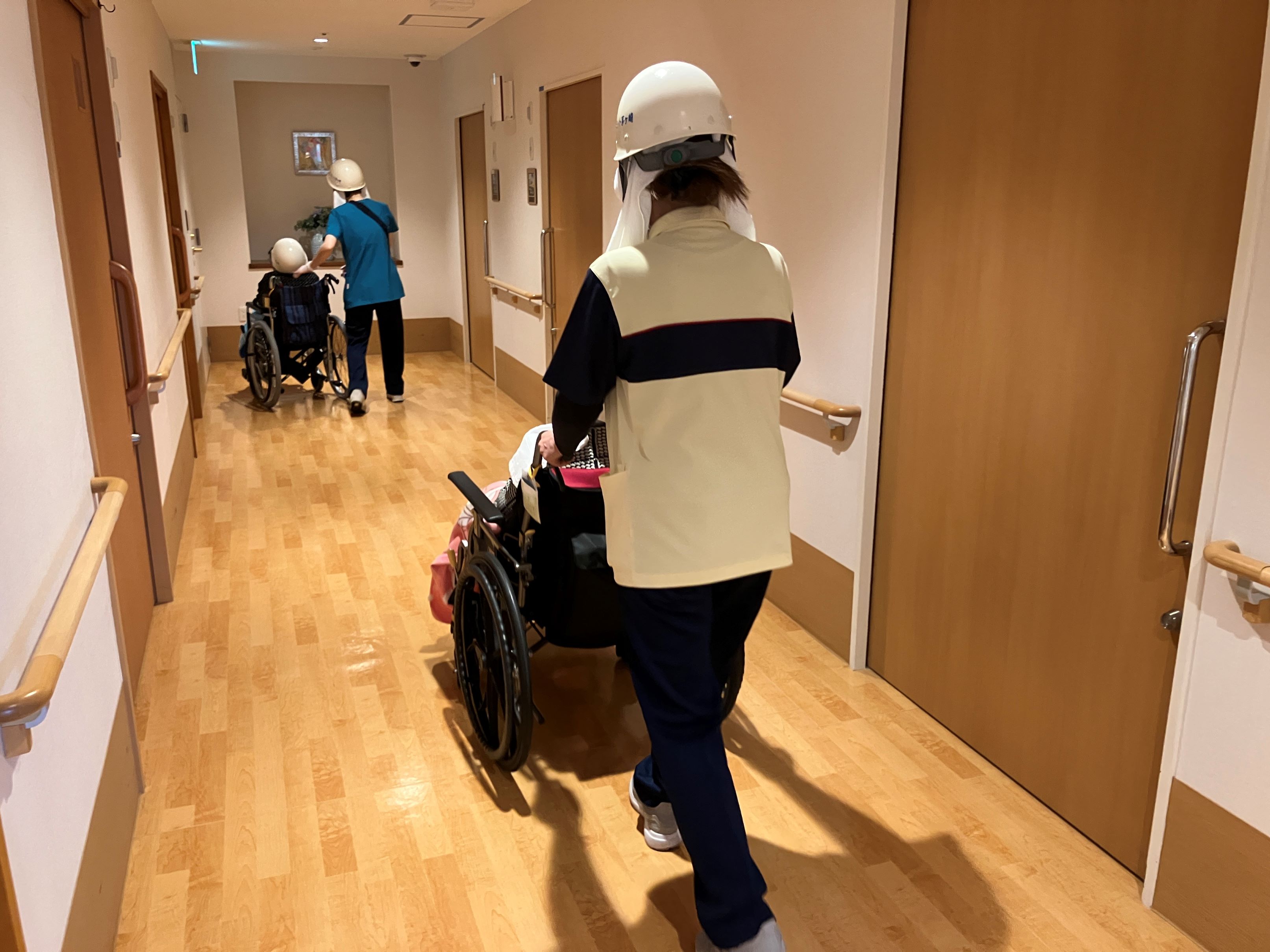 職員をはじめご入居者も20名以上の方に参加いただき、建物廊下より避難用スロープから車イスで避難する訓練を実施しました。
