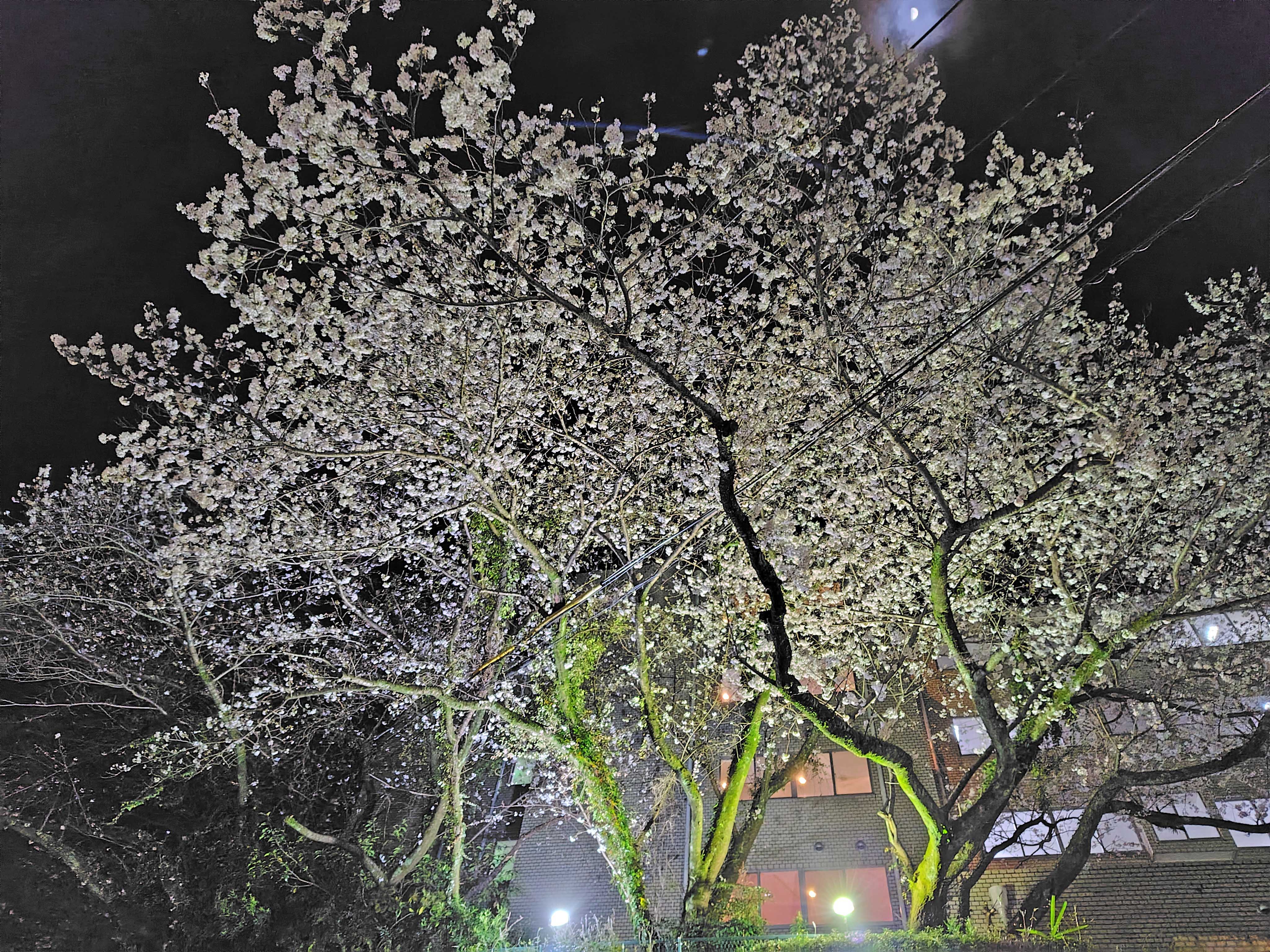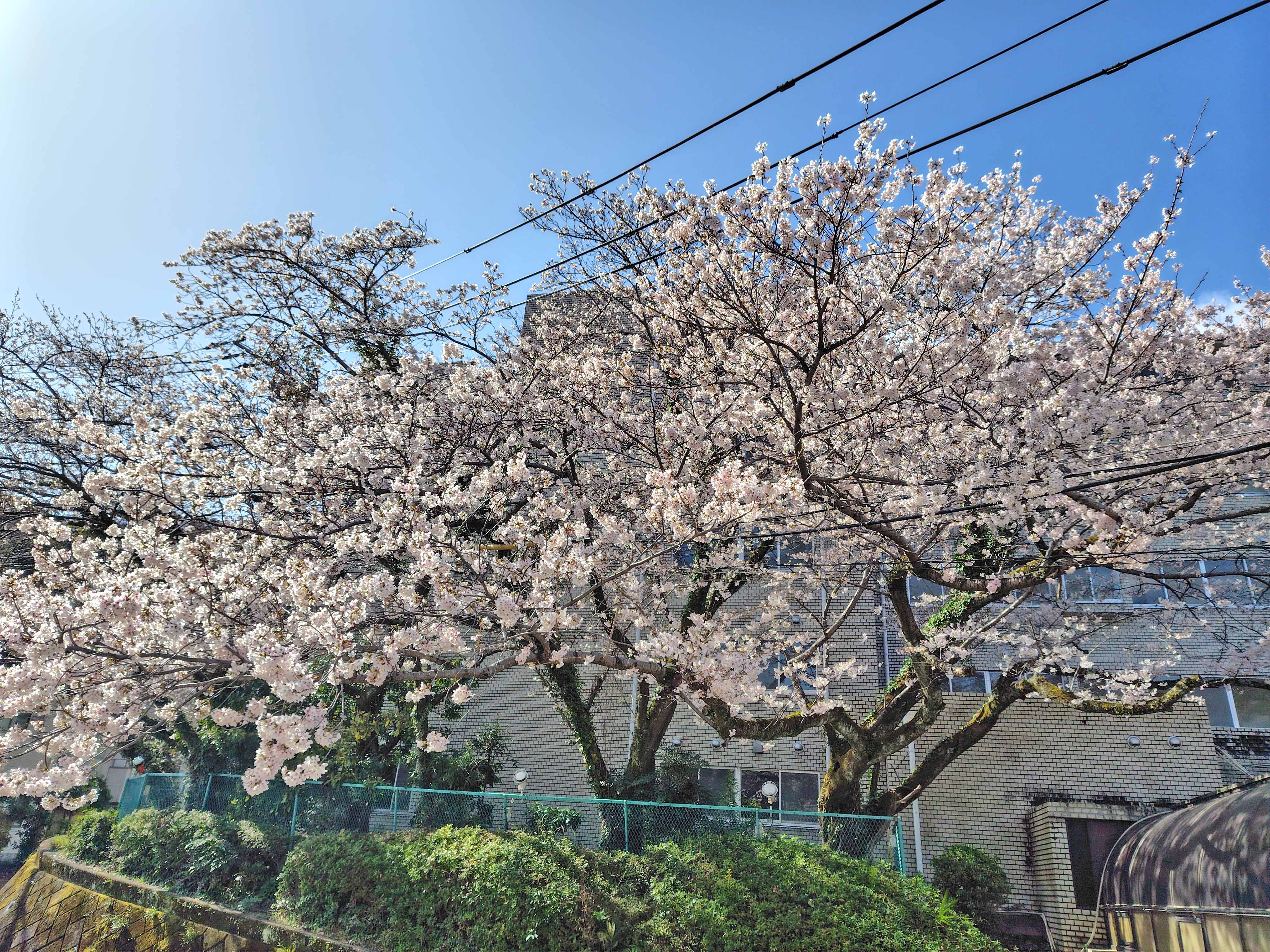 1日中陽が当たる場所にある桜の木は満開となり、昼間は青空に映える美しい姿を