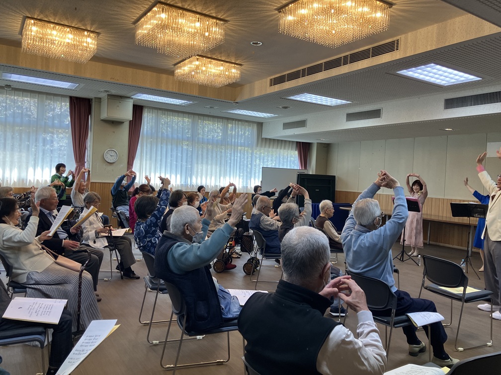 ご入居者も一緒に歌うこのコンサートでは、初めは小声で遠慮がちに歌われていましたが