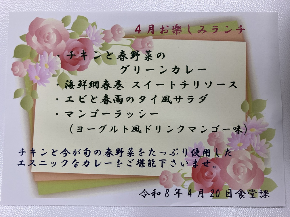 ネオ・サミット湯河原の昼食で、月に一度のお楽しみランチが提供されました。