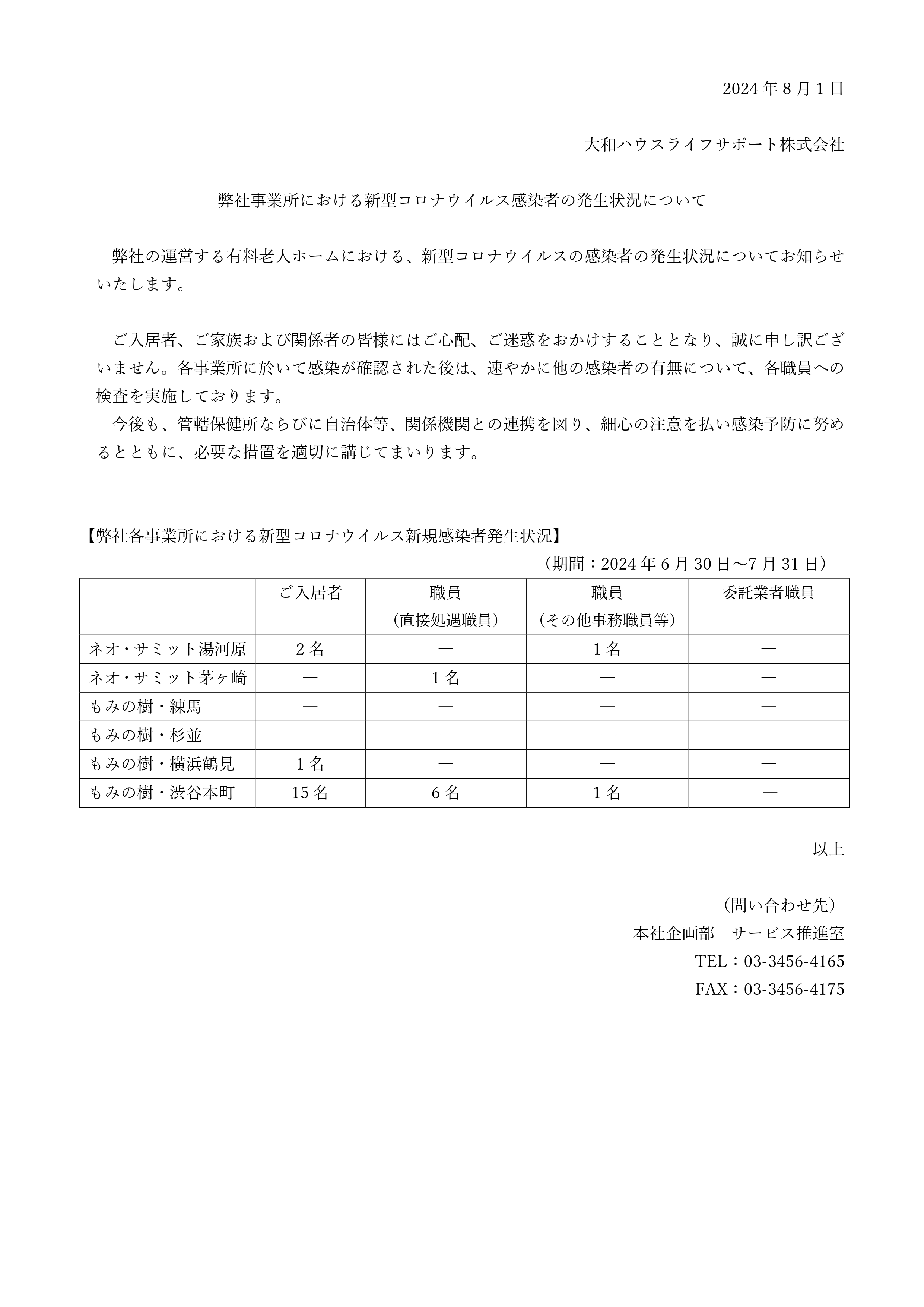 新型コロナウイルス感染者の発生状況について【 2024年7月31日現在】